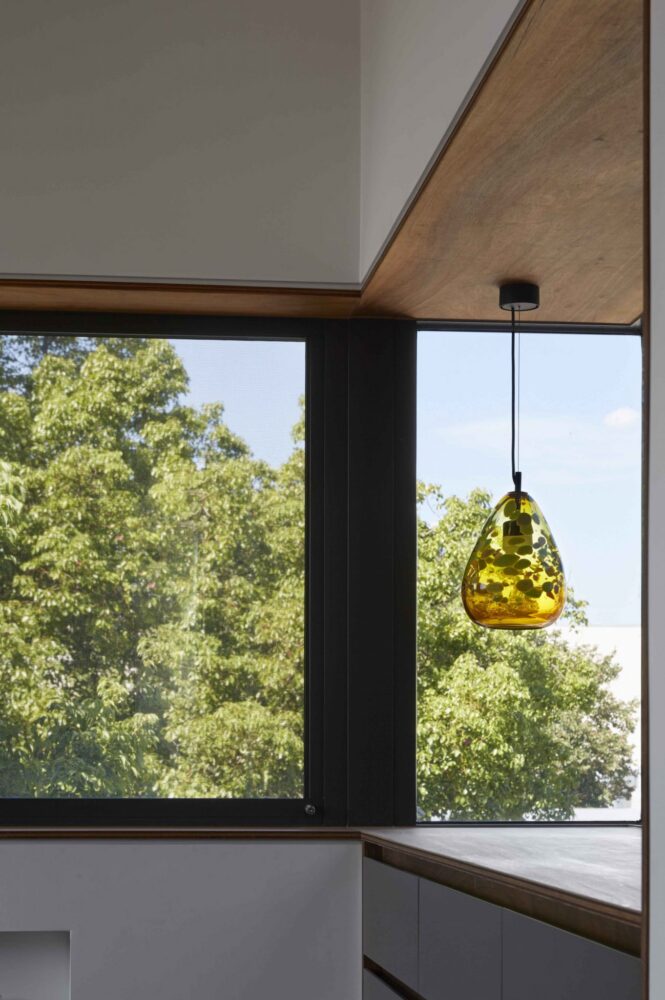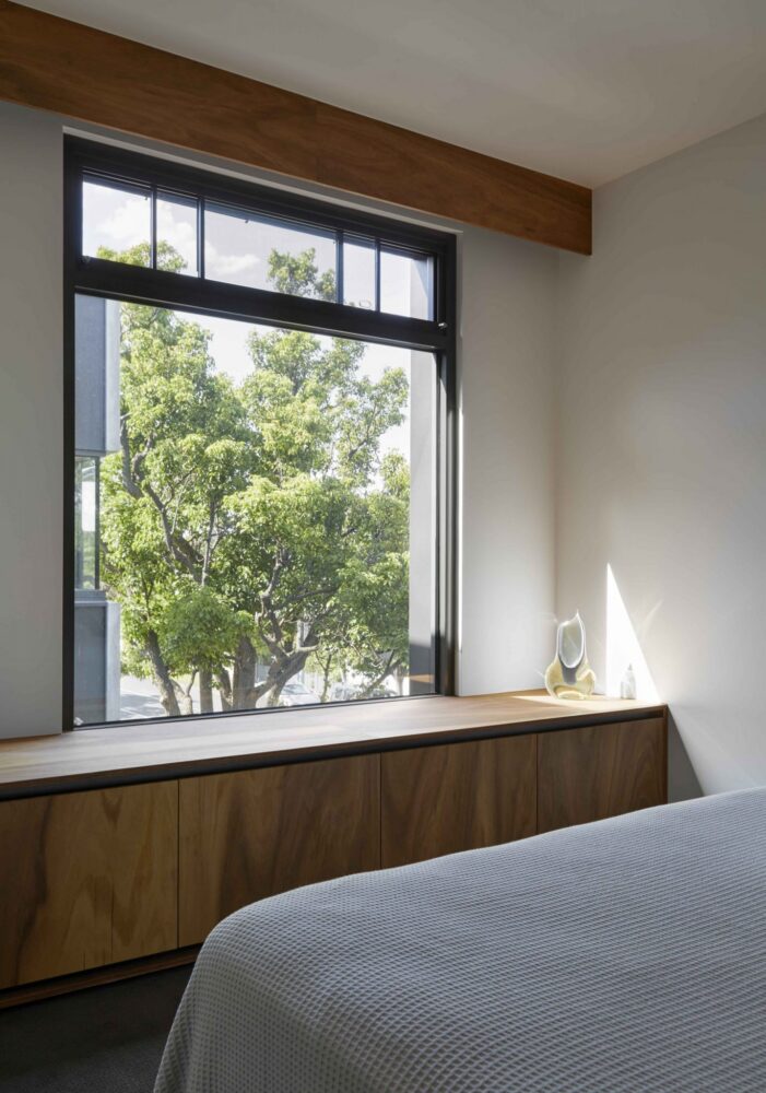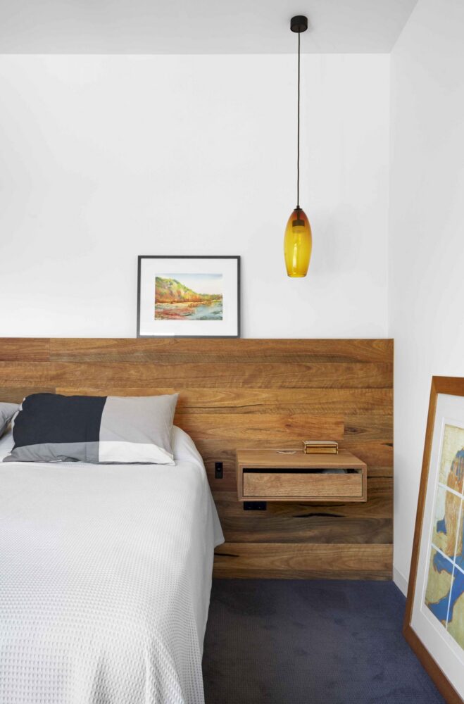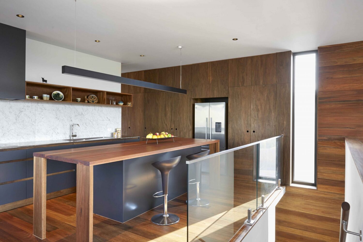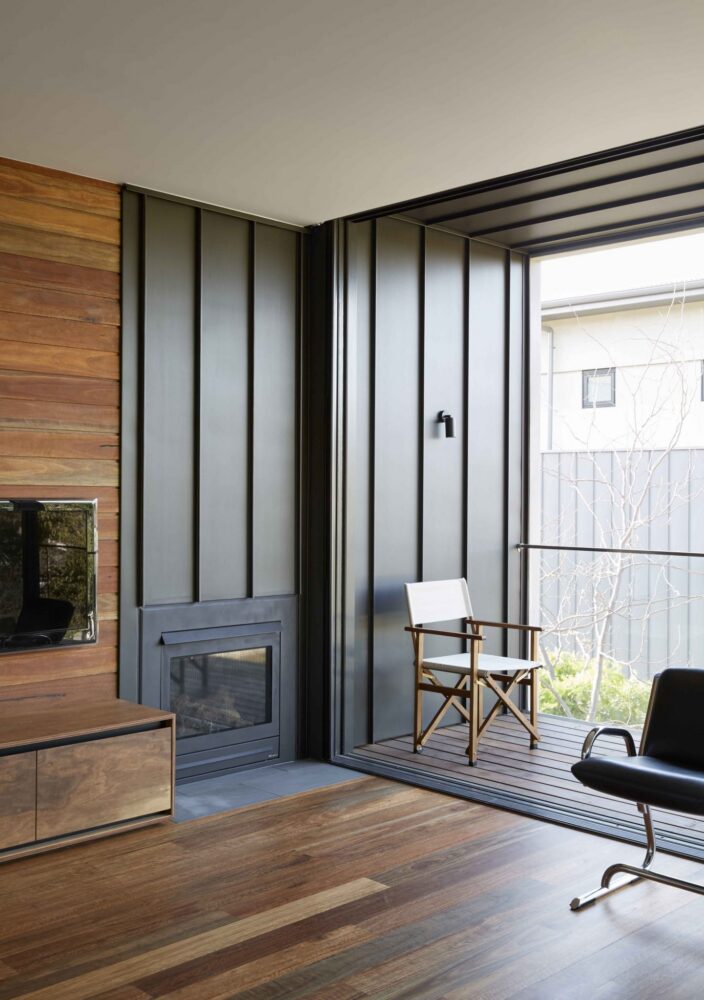 The unit is full of features, use of timber is prominent throughout the property with spotted gum ply use in majority of the joinery, the timber floor and internal cladded wall in the same solid timber. This timber is complemented with the inclusion of VM Zinc from the external elements brought internally around the fireplace with colour plate used throughout.
