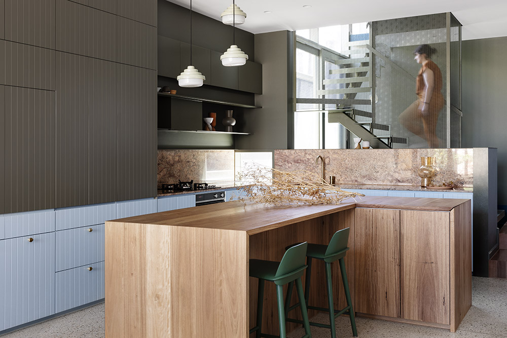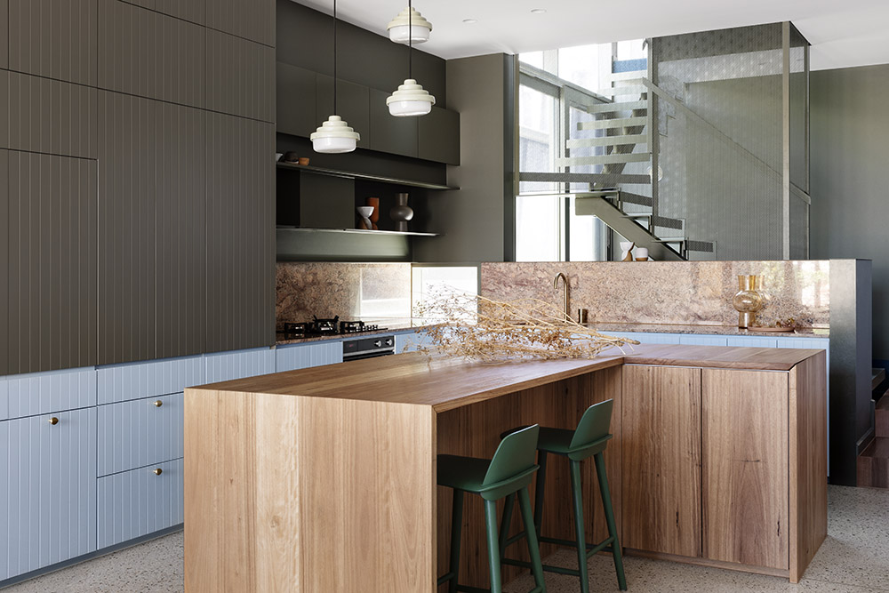 The custom joinery, crafted by our in house team, is a standout, featuring V grooved panels with dual tones incorporated into a single door. Blackbutt benchtops introduce warmth against the concrete floors and stone surfaces, while powder coated overhead cabinetry adds a strong visual focus.
